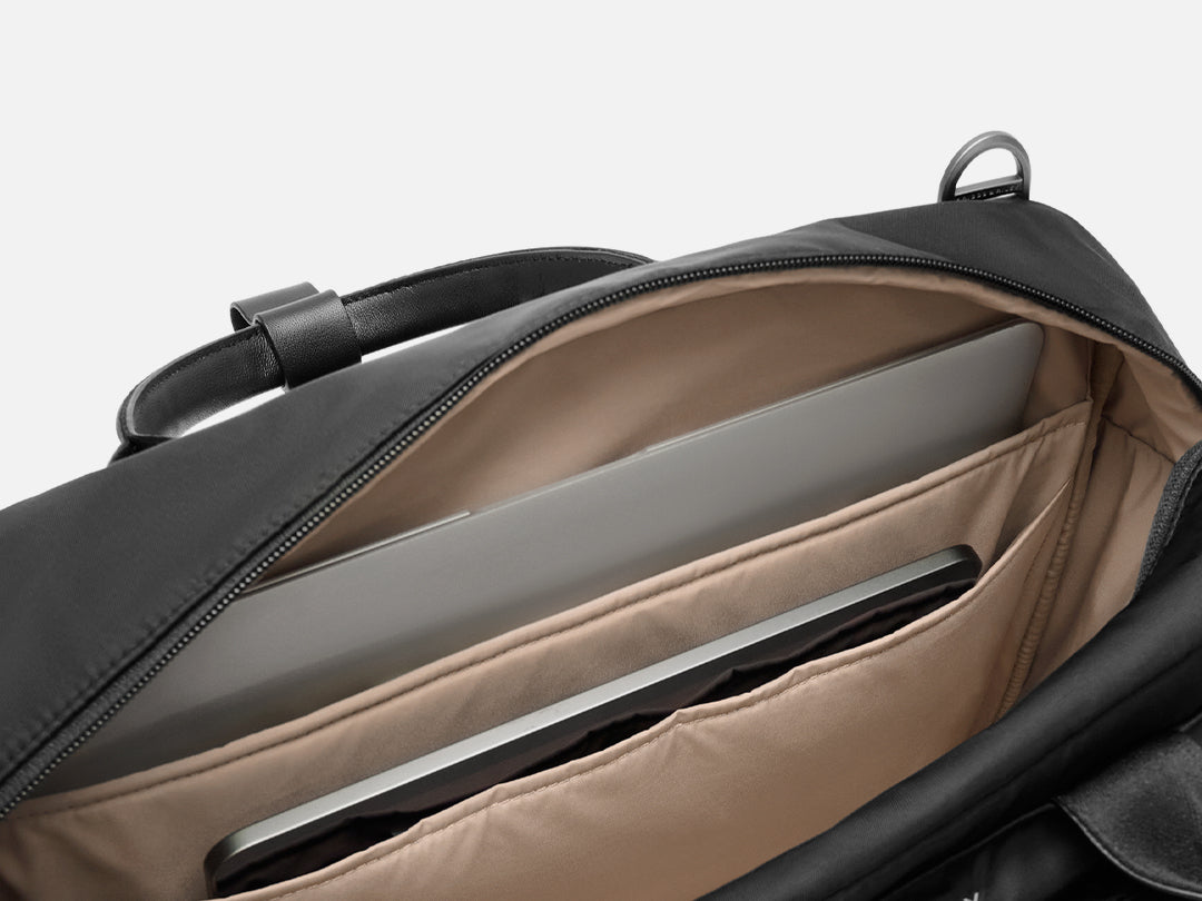 Your ideal weekender bag is here—designed with soft leather handles (plus a shoulder strap for versatility), a spacious compartment for your clothes and laptop, and airport-friendly features like a SpeedThru™ pocket and a slip-through back panel to slide over luggage handle.
