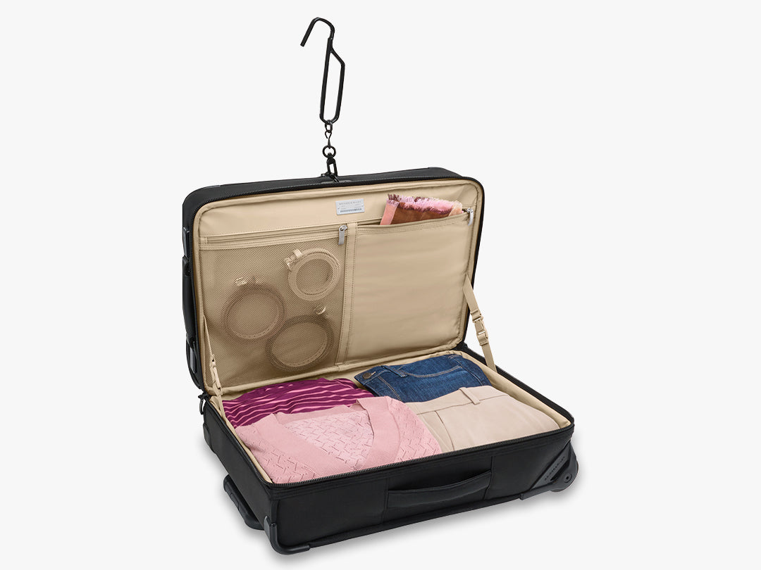 - Hanger bracket to securely hang 1-3 garments, keeping it wrinkle-free and just as you packed them.